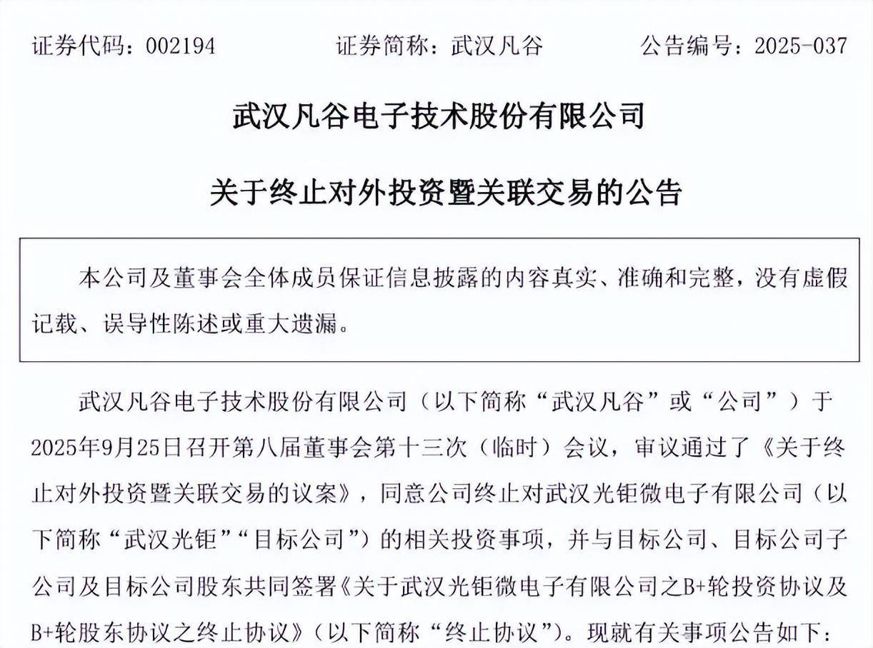 新业务拓展的受阻进一步加剧了经营压力。9月26日,武汉凡谷公告终止对武汉光钜微电子有限公司的B+轮投资。此前,公司于2025年3月已签署相关投资协议,旨在切入射频前端芯片领域以拓展业务边界。对于终止原因,公司表示受境外政策波动及国内行业竞争加剧影响,武汉光钜经营环境发生变化,中长期发展不确定性上升,业绩扭亏面临挑战。