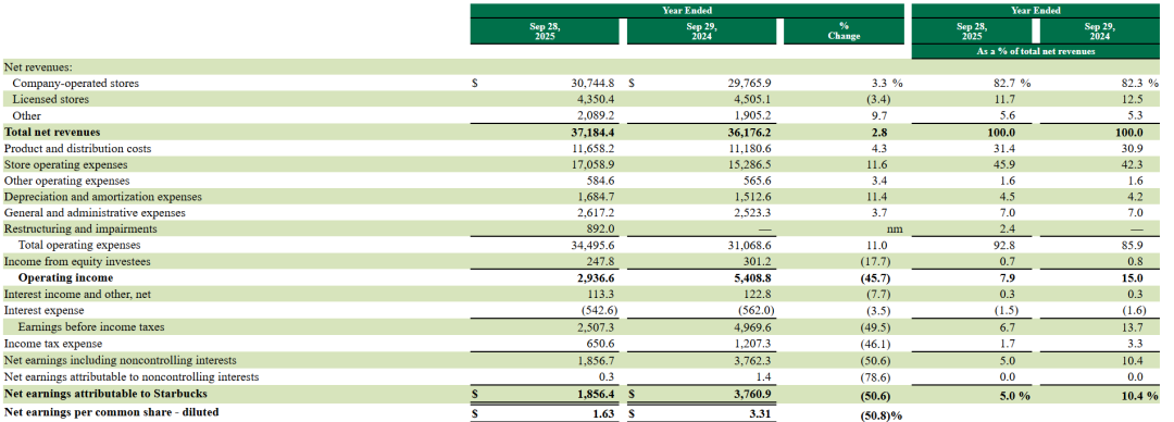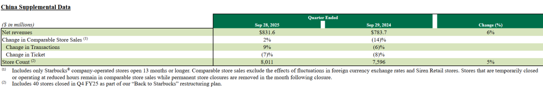 值得一提的是,在合资公司尘埃落定的同时,星巴克的业绩表现也出现了明显好转。星巴克近日公布的2025财年(截至2025年9月28日)及第四季度财报显示,全球总体营收同比增长5%,第四季度全球同店销售额增长1%,这是七个季度以来首次实现正增长,整体表现超出市场预期。