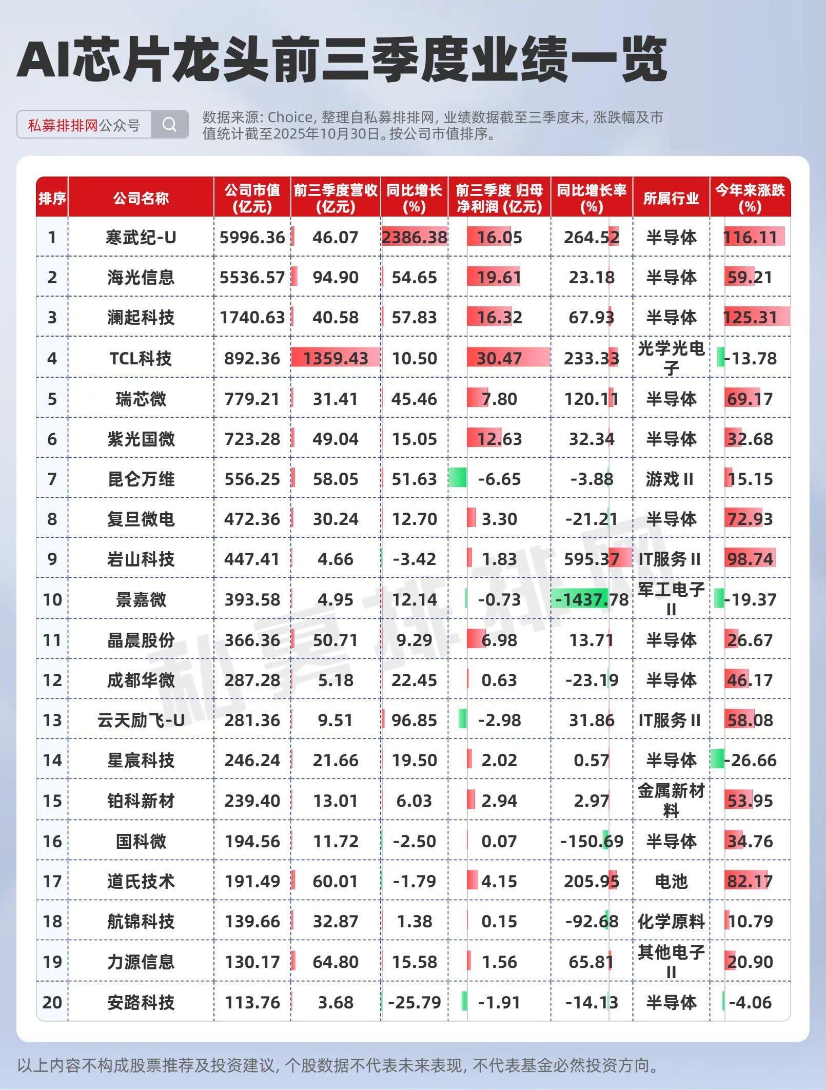 A股前二十大市值AI芯片企业年内平均涨幅42.95%,寒武纪-U、澜起科技涨幅超100%。头部企业业绩表现:寒武纪-U营收40.07亿元(同比+2386.38%),净利润16.05亿元(同比+264.05%);澜起科技营收40.58亿元(同比+57.83%),净利润16.32亿元(同比+67.93%);瑞芯微营收31.41亿元(同比+45.46%),净利润7.80亿元(同比+120.11%)。