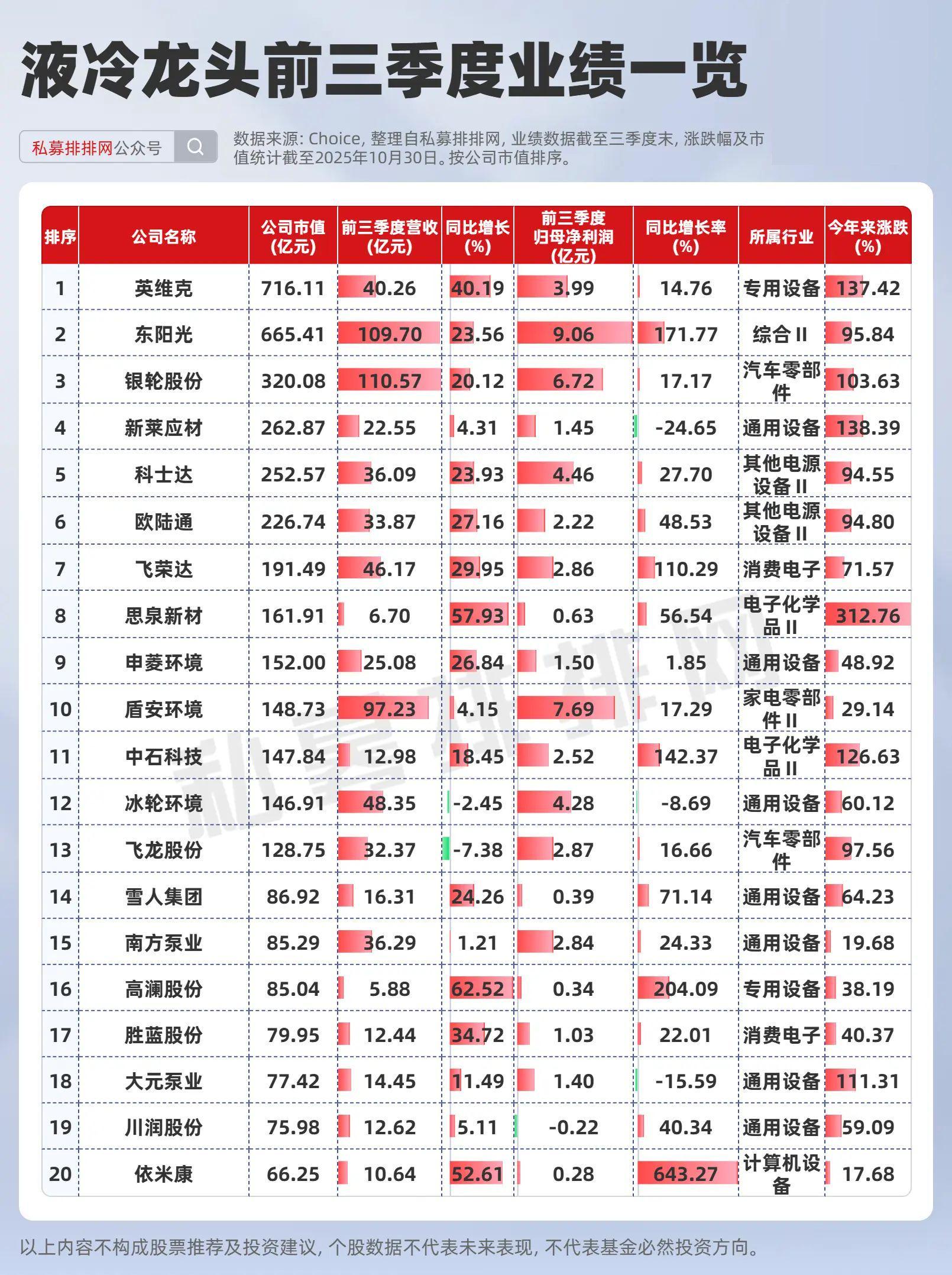 A股前二十大市值液冷企业年内平均涨幅88.09%,6只个股涨幅超100%。头部企业业绩表现:英维克营收40.26亿元(同比+40.19%),净利润3.99亿元(同比+14.76%);东阳光营收100.70亿元(同比+23.56%),净利润9.06亿元(同比+171.77%);飞荣达营收46.17亿元(同比+29.95%),净利润2.86亿元(同比+110.29%)。