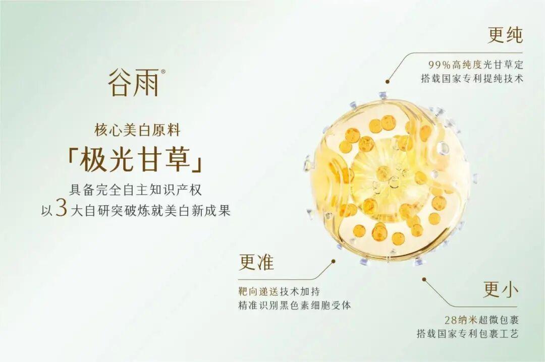 除了抓住流量风口,谷雨成功的另一关键要素是强绑定‘光甘草定’这一成分,反复渗透‘美白’概念。