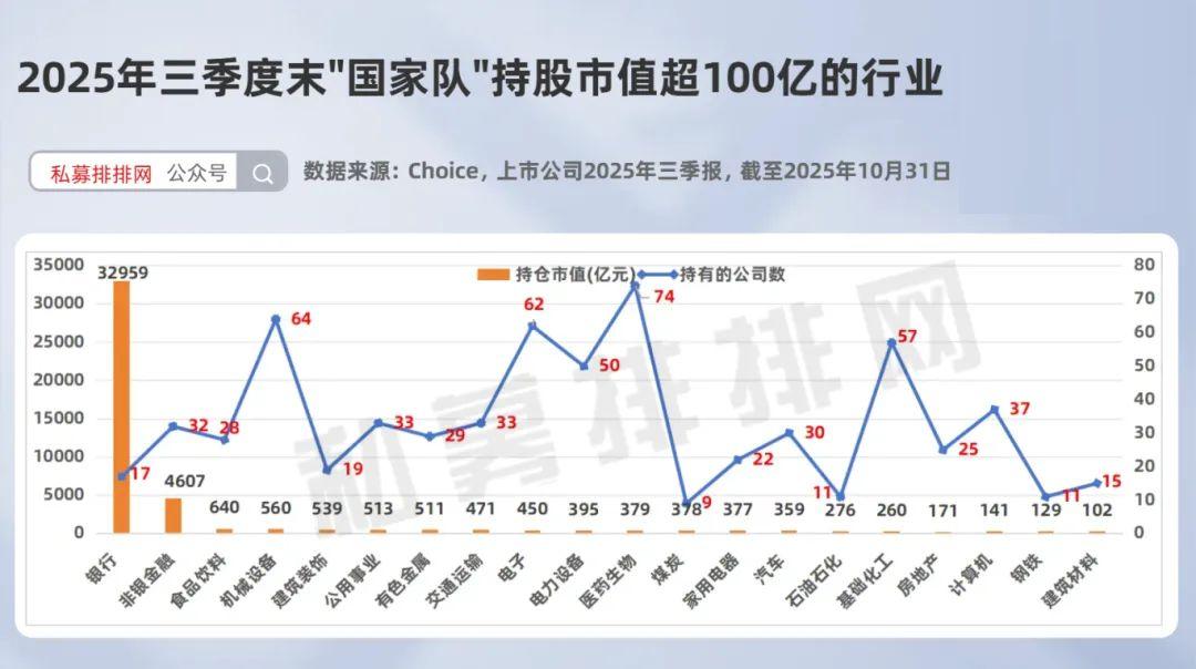 在33只持股市值超百亿的股票中,非银金融(9家)和银行(8家)占据主导。农业银行凭借三季度16%的涨幅,以超万亿持股市值取代中国银行成为第一大重仓股。值得关注的是,'国家队'对三大国有行(农行、中行、工行)合计持仓超3.16万亿元,占A股总持仓比例超70%。