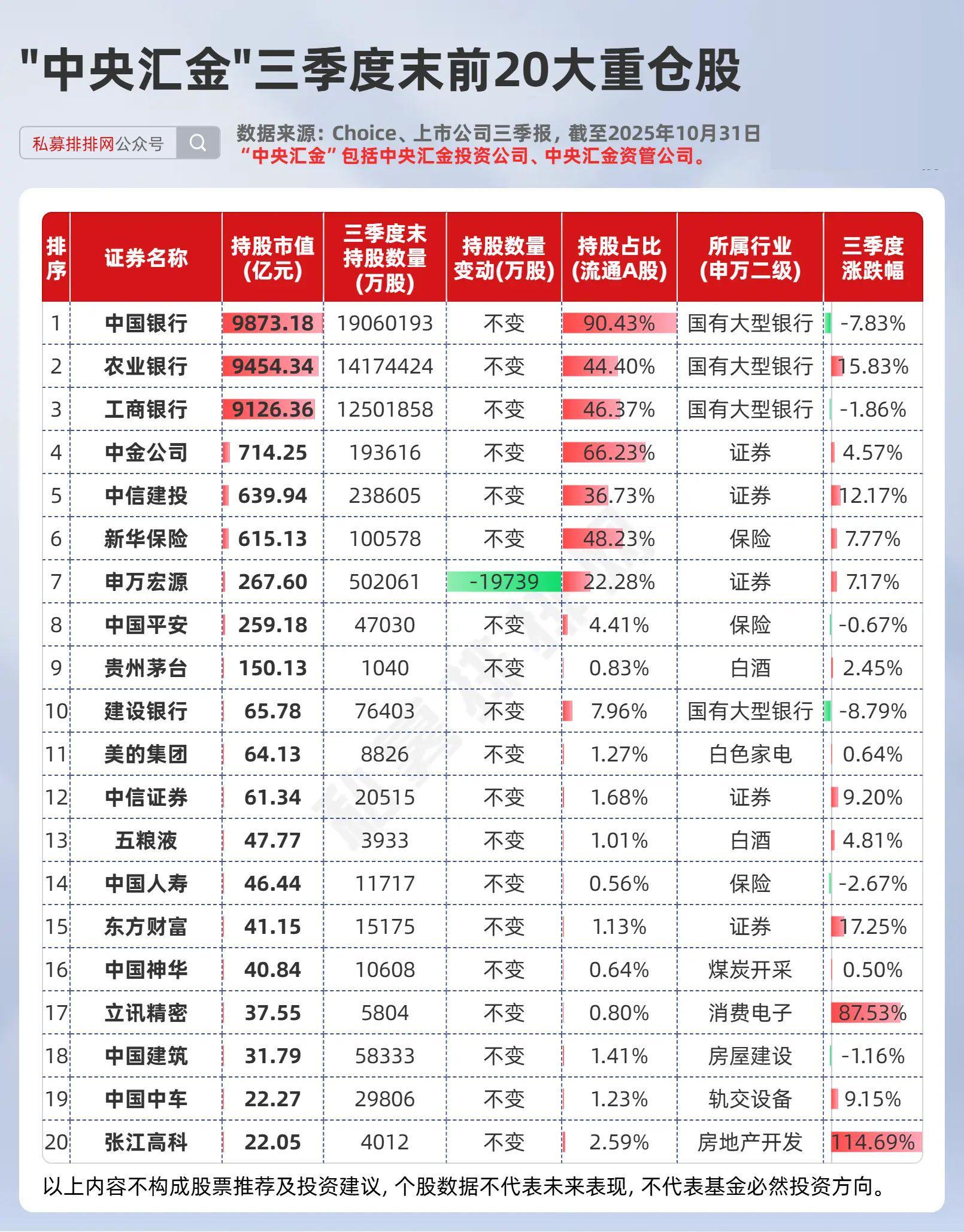 中央汇金前20大重仓股中,非银金融和银行分别占8家和4家,中国银行、农业银行、工商银行位列前三。社保基金则更显均衡,前20大重仓股中银行和非银金融各占3家,农业银行、工商银行、中国人保成为前三大持仓。值得注意的是,光刻机概念股张江高科三季度获'国家队'持有4012万股,持股市值超22亿元,期间涨幅达114%。