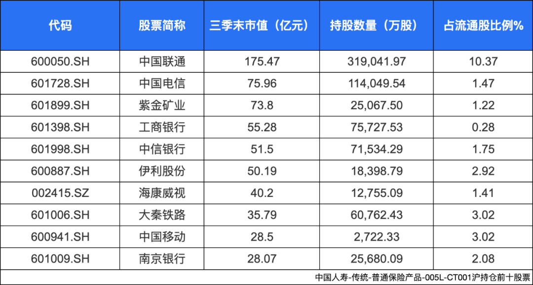 在所有持仓账户中,‘中国人寿保险股份有限公司-传统-普通保险产品-005L-CT001沪’账户尤为引人注目。Wind数据显示,截至三季度末,该账户现身136只股票的十大股东名单,期末参考市值合计达1255.65亿元,堪称公司股票投资的‘基石账户’。从持仓结构看,该账户重仓运营商三巨头、工商银行、中信银行等金融股,同时配置了消费、资源、基建等高股息标的。三季度,该账户新进紫金矿业、工商银行和海康威视三只股票,其中紫金矿业持仓市值达73.8亿元,位居第三。值得注意的是,紫金矿业年内涨幅接近翻倍,三季度单季涨幅达52.7%。