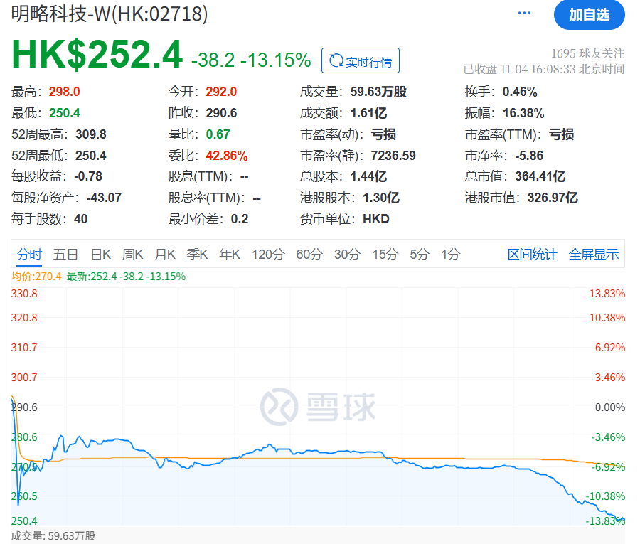 上市首日,股价开盘即飙升至280港元,较发行价上涨近一倍,盘中最高触及309.8港元。当日收盘报290.6港元/股,涨幅高达106.1%,总市值突破419.6亿港元。尽管今日股价回调至252.4港元,总市值仍达364.41亿港元(折合人民币333.96亿元)。