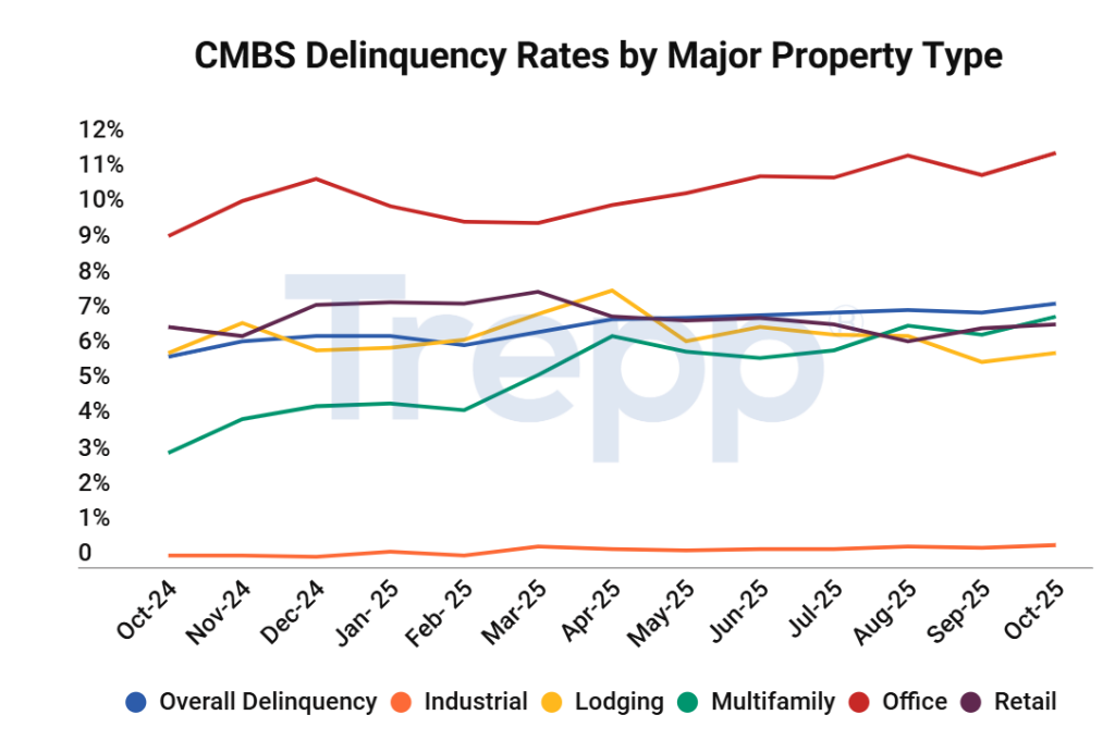 危机呈现明显的蔓延态势。多户住宅地产领域同样遭受重创,10月CMBS违约率激增53个基点至7.1%,创下2015年以来的最差表现。这表明商业地产市场的结构性调整已从办公领域向居住领域扩散,形成系统性风险。