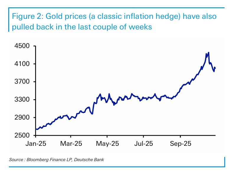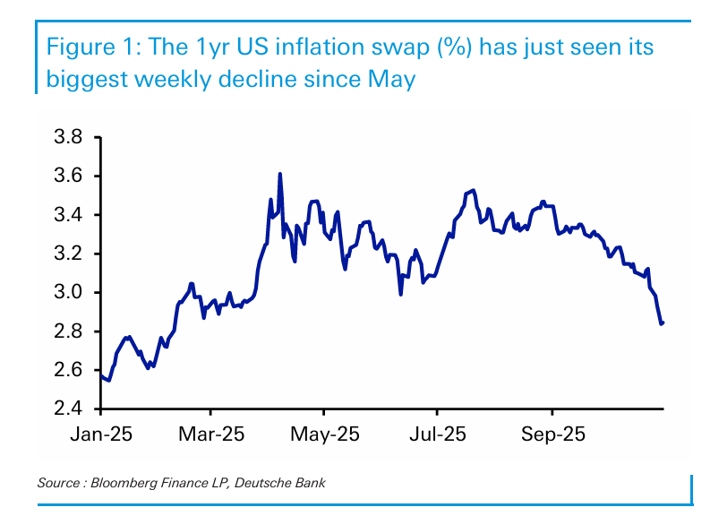 据追风交易台消息,德银在11月3日的报告中指出,受益于上周的贸易缓和,美国1年期通胀互换(inflation swap)录得自5月以来的最大单周跌幅。与此同时,作为传统通胀对冲工具的黄金价格也已从高点回落,市场似乎暂时松了一口气。