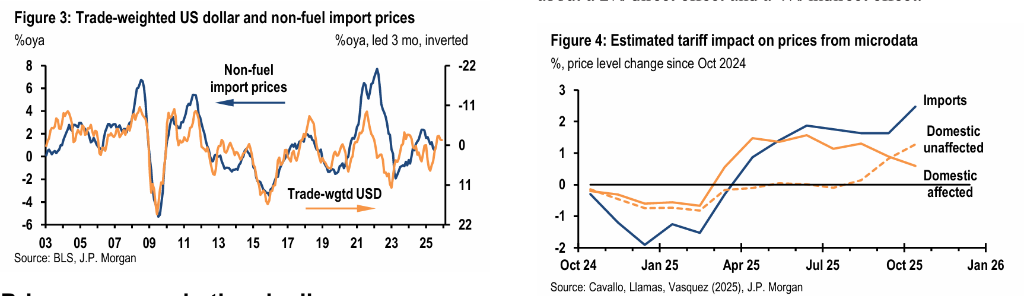 在众多通胀驱动因素中,关税的影响尤其值得关注。摩根大通的研报深入分析了这一问题,认为尽管传导过程比预期缓慢,但美国消费者最终将承担大部分关税成本。