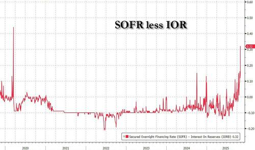 融资市场紧张状况通过多个核心指标显现。除SRF异常高使用量外,本周一隔夜一般抵押品回购利率(GC Repo Rate)在4.14%至4.24%区间波动,远高于美联储3.9%的准备金利率(IORB)及3.75%至4%的联邦基金利率目标区间。ICAP数据显示,三方一般抵押品回购利率与准备金利率的利差也飙升至25个基点,同样为新冠疫情以来最高水平。