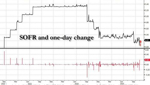 关键利率指标发出强烈警报。10月31日,被视为市场融资成本基准的担保隔夜融资利率(SOFR)飙升22个基点至4.22%,创下一年来最大单日涨幅。该利率与联邦基金利率走廊中枢的利差扩大至32个基点,达到2020年3月市场危机以来的最高水平,显示资金紧张程度远超正常水平。