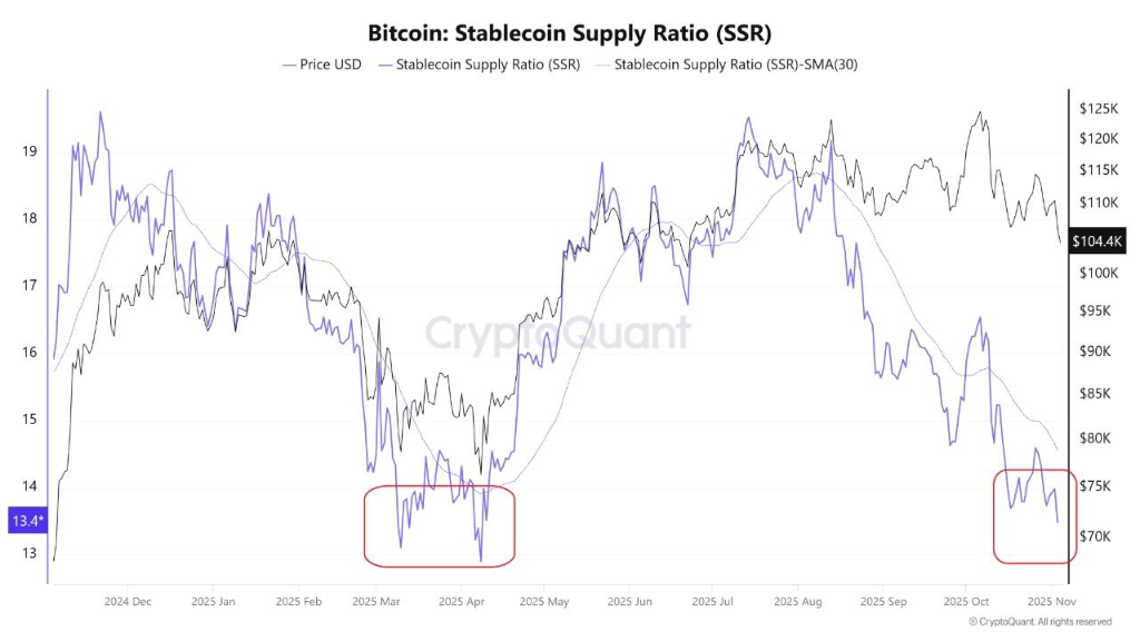 CryptoQuant数据显示,稳定币供应比率(SSR)已回落至13-14区间,该水平在历史上多次成为市场流动性拐点。较低的SSR值意味着稳定币余额相对增加,暗示场外购买力正在悄然积累。分析认为,这可能为报复性反弹或本轮周期的最后一段牛市行情创造条件。
