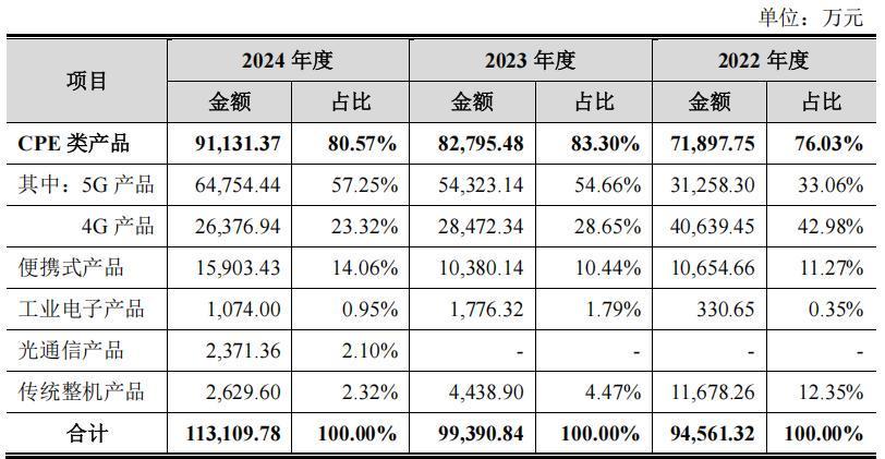 报告期内,通则康威主营业务收入来源于CPE类产品、便携式产品、工业电子产品、光通信产品、传统整机产品等,以5GCPE为代表的5G产品收入增长较快。其中,CPE类产品收入占比分别为76.03%、83.30%和80.57%,为公司最主要的收入来源。