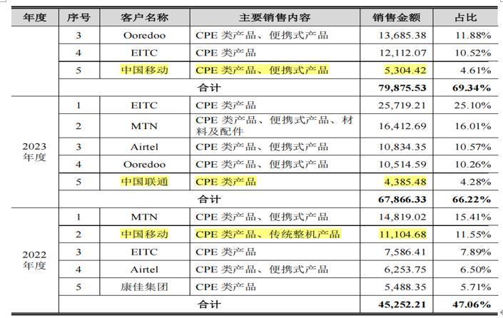 报告期内,公司前五大客户主要包括Airtel(证券代码:BHARTIARTL.NS)、MTN(证券代码:MTN.J)、Ooredoo(证券代码:ORDS.QA)、EITC(证券代码:DU.DFM)、中国移动、中国联通、康佳集团(000016.SZ)等。2022年-2024年,前五大客户收入合计占比分别为47.06%、66.22%和69.34%。客户集中度较高可能增加公司的经营风险。