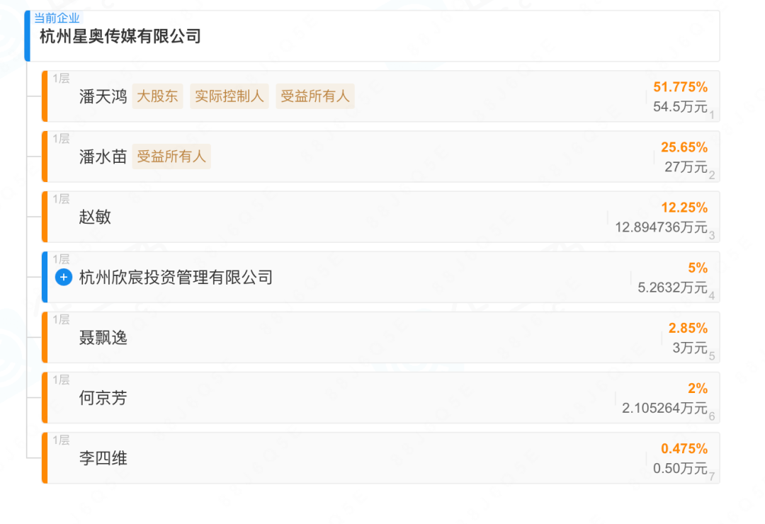 ( 在杭州星奥传媒文化有限公司的持股信息里,潘水苗有25.65%的持股 )