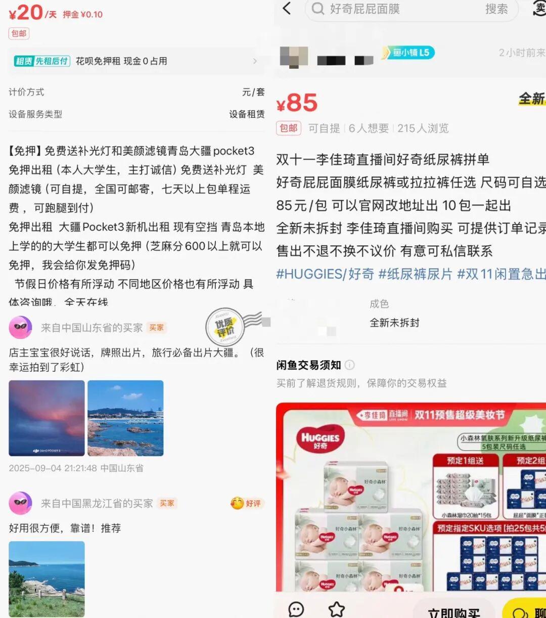 闲鱼的魔力远不止于省钱。这个充满创造力的场域,正在为标准化电商无法满足的需求提供解决方案。00后群体展现出惊人的资源整合能力,双十一期间专柜代购订单量达90后近3倍,他们通过柜哥柜姐内购、粉丝转让礼盒等方式,构建起基于信任的稀缺品交易网络。更有趣的是,这里兴起“试错经济”:3C数码租赁订单暴涨300%,大疆Pocket3成热门试用品;美妆小样分装销量增长33%,消费者通过“前置体验”降低决策风险。