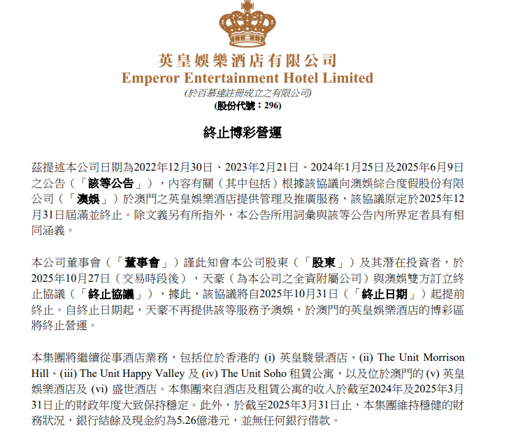 今年6月9日,澳博控股(00880.HK)曾发布公告,决定不再在包括英皇宫殿在内的若干卫星娱乐场继续经营博彩业务。10月27日,澳博控股进一步宣布,澳娱综合与天豪相互同意并订立终止协议,该协议自2025年10月31日起提前终止。终止后,天豪不再向澳娱综合提供服务,英皇宫殿娱乐场于10月30日23时59分提前正式结束营运。