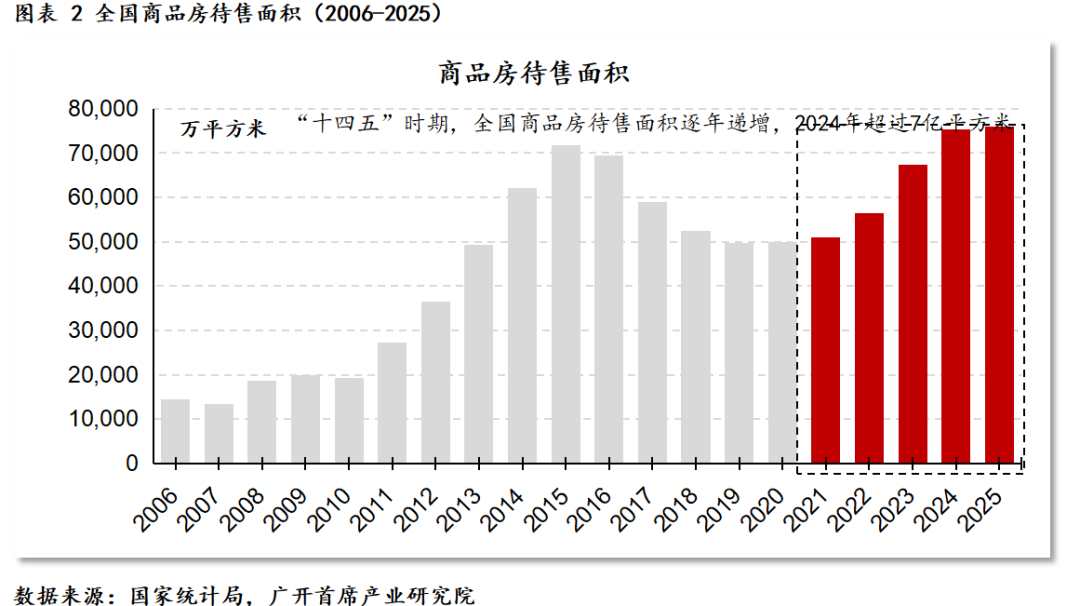 我国将进入第一个完整五年规划期的人口减少周期。尽管国内在“十四五”时期后半段已经全面放开生育政策,人口下降过快的问题得到一定程度缓解,但无法根本解决人口迭代的趋势性发展。根据联合国发布的《世界人口展望2024版》的预测,到2030年,我国总人口约14亿人,较2025年总人口净减少480万人左右。经测算,适龄购房人群总量和占比均有所下降,适龄购房人群总数可能减少2100万人,占总人口比重将从39.2%降到38%。房地产需求长期看人口,由于未来中国总人口规模将持续减少,而适龄购房人群减少的数量可能更多,下一个阶段,全国住宅购置需求减少将是大概率事件。
