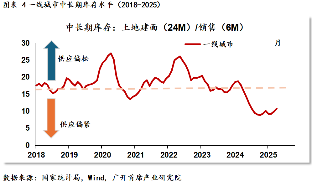 五是土地市场总体仍然较为疲软。按照经济高质量发展的要求,“十五五”时期我国土地市场将延续集约化道路,意味着可供拍卖的住宅用地规划建设面积仍然可能会持续减少,尤其是低能级城市土地供给方面仍将价低量减。鉴于低能级城市库存高、住房需求弱,其土地供求比在“十四五”末期已经大幅回落,从2020年末的1.27降至1.16,预计“十五五”时期低能级土地市场供求比可能降至1.10左右,土地成交金额累计下降约三成。而一线及部分高能级城市土地市场有望在“十五五”时期走稳复苏,因长期库销比( 长期库销比=连续2年土地建筑面积/连续6个月商品房销售面积)处于供给不足的水平(见图4)。截至2025年上半年,一线城市商品房长期库存约11个月,远低于18个月的均衡水平。预计到“十五五”末期,一线城市每年土地成交金额为450亿元,较“十四五”末期增长2.8%,同期一线城市土地成交占比也将从18.5%升至接近25%。综合测算,“十五五”时期年均土地购置费约达3.2万亿元,较“十四五”时期累计下降16.5%。