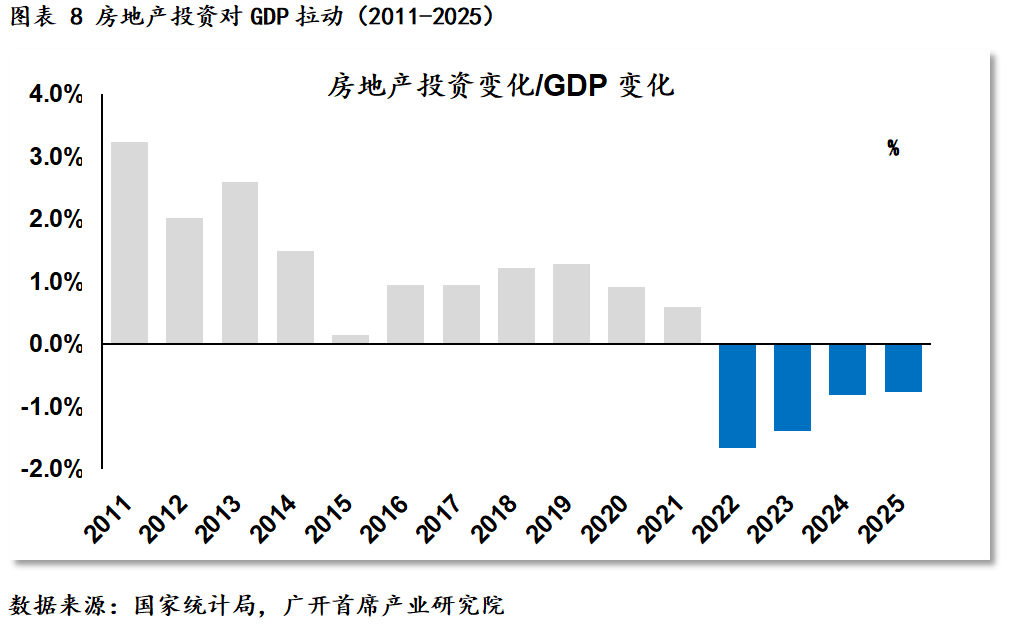 “十五五”时期,国内房地产市场总体仍将处于由筑底走向平稳运行的阶段,房地产市场本身运行趋稳并不等同于房企市场风险完全可控。“十五五”前半期,房地产市场下行仍然可能是拖累GDP增长的最主要因素。经测算,“十五五”时期,房地产投资平均每年跌幅为4.5%,假设GDP增速在4.5%左右,预计平均每年房地产投资对GDP的贡献率下降约6个百分点,拖累GDP增速0.25个百分点左右(见图8)。尽管拖累程度较“十四五”时期有所减轻,但长期对经济造成的负面影响不可小觑。在我国居民消费支出结构中,直接与住房相关的支出占比约四分之一,包括房产购置、日常租金、水电煤能源支出,另外还有与之相关的装潢建材、家电、家具等,而房地产市场的下行意味着居民相关消费支出的减少,进而拖累整体消费增长。从居民收入端来看,由于存量商品房仍有下行压力,房产作为普通居民最主要的非金融资产,长期的持续资产减值缩水将进一步影响居民日常的消费支出能力和消费偏好。预计“十五五”时期,房地产投资下行每年可能拖累固定资产投资约0.5个百分点,这对当下不到3%的固定资产投资增速而言,其拖累程度不言而喻。土地出让收入的减少对地方财力形成制约,进而直接减少地方基建投资。