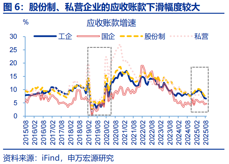 需求:需求压力或更多指向制造业,主要表现为企业加快清偿欠款,对投资产生额外拖累。近两年部分企业以欠款形式增加投资,本轮化债也要求企业加快清缴欠款;由于当前企业盈利偏弱,企业或将用于投资资金清缴欠款,导致固定投资回落。2025年6月来应收账款增速明显下滑,与固定资产投资回落的时点基本一致;9月其进一步降至5.7%,短期清缴欠款或仍拖累制造业投资。