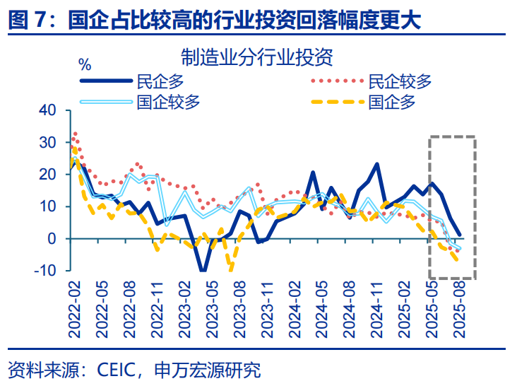 需求:需求压力或更多体现在制造业领域,主要表现为企业加快清缴欠款,对投资产生额外拖累。近两年部分企业以欠款形式增加投资,本轮化债除聚焦地方政府外,也要求企业加快清缴欠款;由于当前企业盈利偏弱,企业或将用于投资的资金清缴欠款,导致固定投资回落。2025年6月来应收账款增速明显回落,与固定资产投资回落的时点基本一致,也与2019年清缴中小企业欠款时类似。9月应收账款增速进一步降至5.7%,短期来看清缴欠款或仍对制造业投资产生拖累。此外,去年来,制造业投资表现强劲并非源于政策驱动,更多是设备处于自然更新的上行周期;但下半年来,自然周期进入退坡阶段;制造业投资较固定资产增速的差值在达阶段性顶点后持续回落。