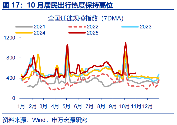 消费:“双十一”提前或短暂支撑商品零售;同时服务领域维持较强的增长韧性,预计社零在本月出现暂时性反弹。在“双十一”促销进一步前置叠加汽车补贴政策调整预期影响下,10月社零或出现反弹(3.4%),推动部分商品消费从11月转移至10月。但随着促销高峰回落,及去年高基数、居民需求“透支”等影响下,商品零售后续或呈弱势表现。而在中秋国庆长假刺激及居民出行维持高位带动下,服务消费需求得到更多释放;税务总局增值税发票数据显示,假期服务消费同比为7.6%、高于商品消费(3.6%),后续消费的增长弹性或更多在服务领域。