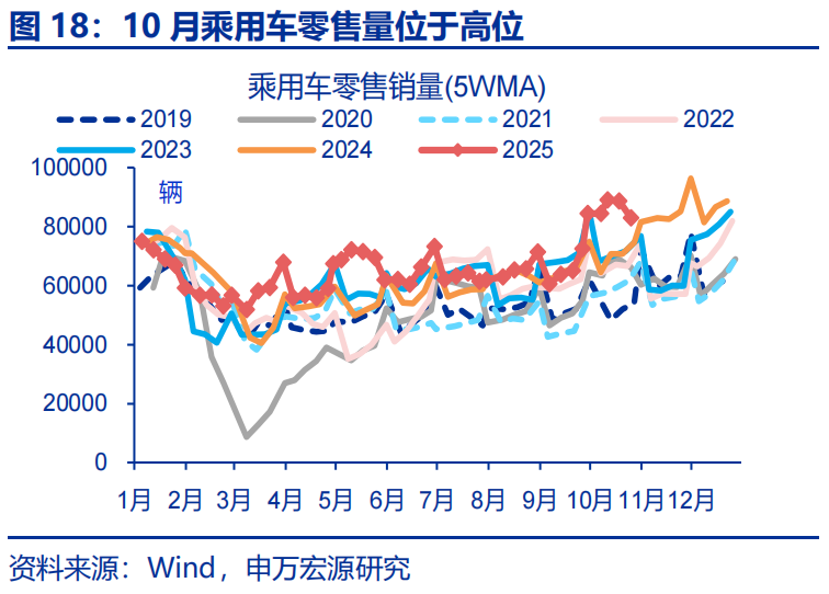 PPI:虽然中下游产能利用率持续偏低,但10月以来上游大宗明显涨价,或推动PPI温和恢复。大宗价格方面,虽然钢价出现较大幅度回落(环比-1.4%),但国内铜价、煤价延续上涨(环比分别7.5%、5.5%),同时国际油价领先我国PPI半个月,9月中旬-10月中旬油价环比降幅收窄至-0.2%,预计大宗价格对PPI贡献仍在持续。但反内卷落地滞后下,中下游产能过剩问题仍较明显,令中下游价格修复斜率偏慢,因而10月PPI修复程度有限、预计可能回升至-2.1%左右。