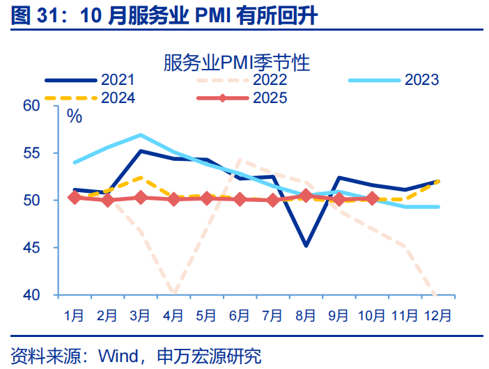 CPI:进入四季度,CPI面临明显低基数效应,加之服务消费韧性支撑核心CPI,预计整体CPI同比可能回升至0%以上。从高频来看,虽然前期生猪存栏增加对猪价的约束仍在显现,10月来猪肉价格环比-8.1%;但鲜菜(3.4%)、鲜果(2%)价格环比表现好于往年同期,加之低基数的影响,食品CPI或有回升。核心CPI方面,国补退坡可能约束核心商品CPI。10月中下旬黄金价格有所回落,但全月金价仍呈上涨态势,或继续支撑首饰、珠宝等CPI。生活性服务业PMI在10月边际改善,加之假期消费价格表现也较好,或也推升核心服务CPI,预计10月CPI同比或有修复(0.4%)。