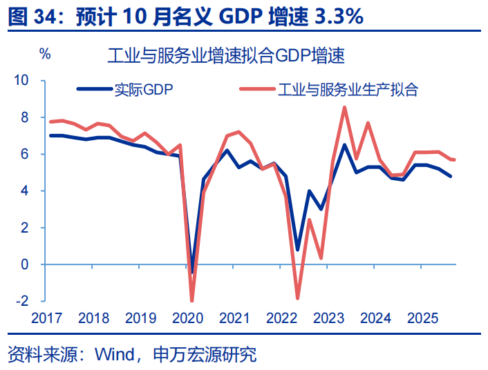 总结:政策已在积极对冲经济的内生压力下,数据拟合后的10月实际GDP或为4.6%、仍保持较高增速。10月以来,“高库存”等短期因素的扰动,或令供给侧对经济景气的约束较大;同时企业加快清偿欠款等影响下,需求侧也面临一定程度的下行风险。但目前政策已在积极落地,近期中央财政从地方政府债务结存限额中安排5000亿元下达地方,政策性金融工具加快落地,化债对投资的挤出效应或趋弱;同时中美关税政策缓和,出口或仍保持高景气,预计短期内经济修复或迎来拐点。生产法下,通过数据拟合来看,10月GDP实际同比或在4.6%左右。
