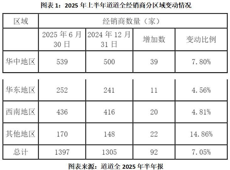 从渠道布局来看,半年报显示,截至今年上半年末,道道全在西南地区的经销商数量已达到436家,与去年年底相比增加了20家,变动比例为4.81%。从数量、增加数和变动比例来看,西南地区的终端网点覆盖仅次于华中地区,这可能表明道道全正在大力布局西南市场。