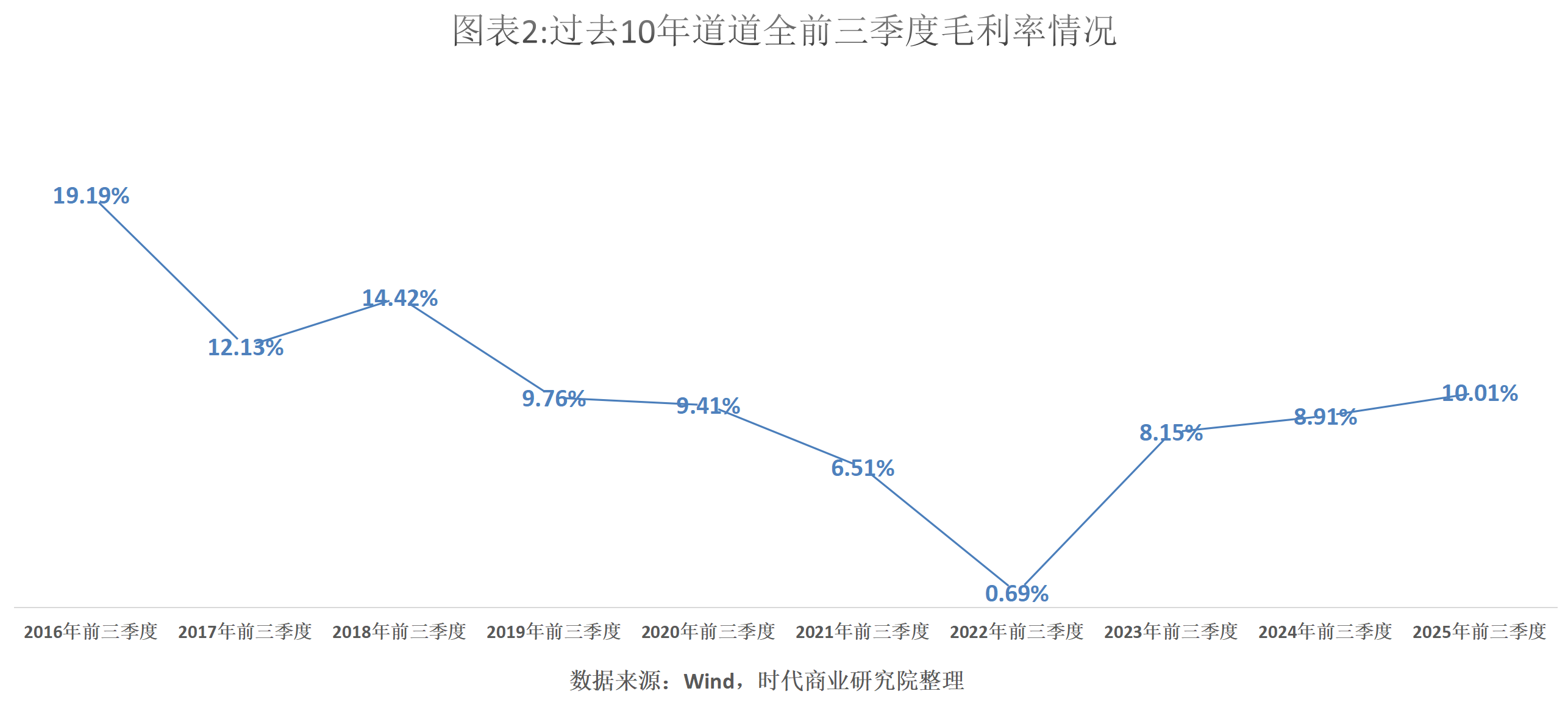 Wind数据显示,今年前三季度,道道全的毛利率为10.01%,较去年同期的8.91%提升了1.1个百分点,达到了自2019年以来的同期最高水平。