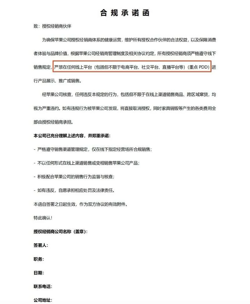 多家权威媒体证实,苹果中国区已向线下授权经销商发布“禁令”:严禁与任何电商平台合作,禁止在电商、社交、直播等线上平台展示、推广或销售苹果产品,甚至“小时达”“一件达”等即时零售服务也被纳入禁令范畴。
