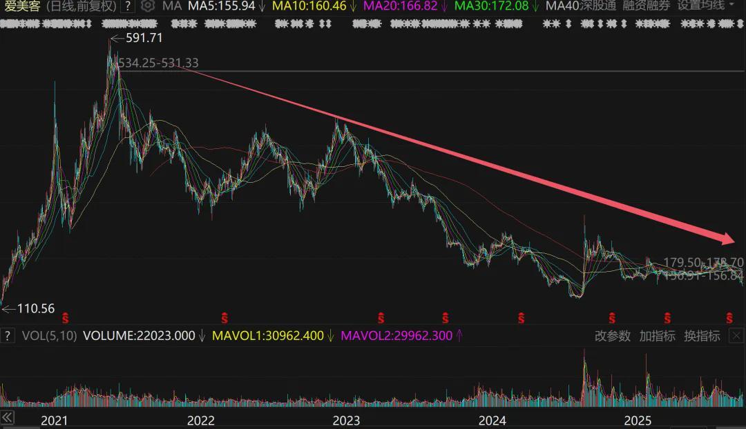 这家曾被冠以“医美茅”的行业标杆,上市初期创下惊人纪录:2020年创业板首日暴涨258%,2021年2月股价突破513元,7月更创下590元历史峰值,市值一度逼近1800亿元,远超华熙生物(1500亿)和昊海生科(500亿)。但泡沫终究难以为继,随着业绩下滑和行业估值重构,爱美客开启价值回归之路:2022年下半年暴跌33%,2023年全年重挫48%,2024年继续下跌13%,2025年三季报发布后股价加速探底。