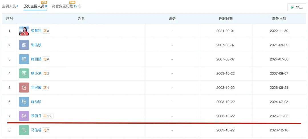 祝丽丹的名字已被转移至历史主要人员名单之列,其卸任日期明确显示为11月5日。