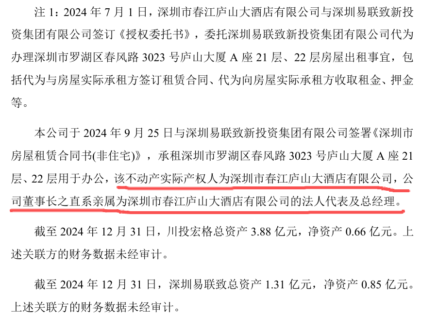 公告披露,上述房产实际产权人为深圳市春江庐山大酒店有限公司(简称“春江庐山大酒店”,原名“深圳春江企业公司”),而公司董事长林晓晴的直系亲属正是该公司的法人代表及总经理。这份公告,揭开了四川最年轻A股董事长神秘背景的重要一角。