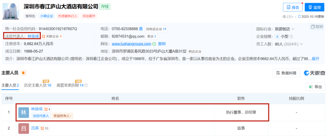 一切信息,均指向一个事实:林晓晴与春江庐山大酒店总经理林俊成是父女关系。公开信息显示,春江庐山大酒店的法人代表及总经理,正是林俊成,也就是深圳庐山集团的董事长。