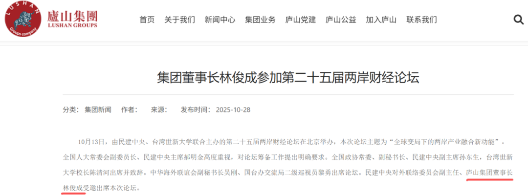 2013年12月,春江庐山大酒店法定代表人由黄小中更换为林俊成,后者也同时成为公司董事长。尽管旗下有香港企业,但林俊成近年来多是以庐山集团董事长的身份活跃于公开报道。