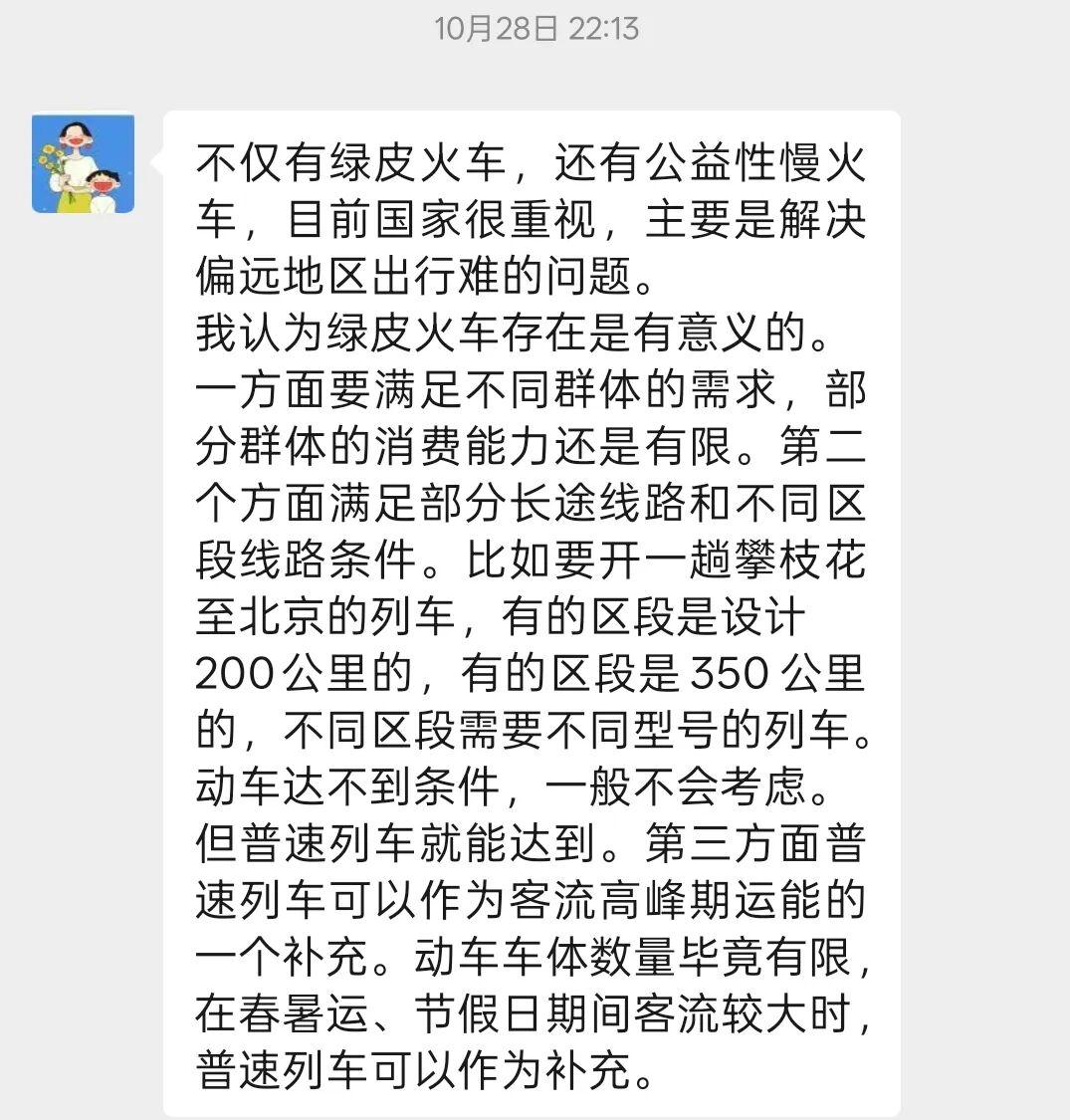 “我认为绿皮火车存在是有意义的。一方面要满足不同群体的需求,部分群体的消费能力还是有限。第二个方面满足部分长途线路和不同区段线路条件。比如要开一趟攀枝花至北京的列车,有的区段是设计200公里的,有的区段是350公里的,不同区段需要不同型号的列车。动车达不到条件,一般不会考虑。但普速列车就能达到。”