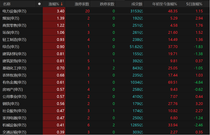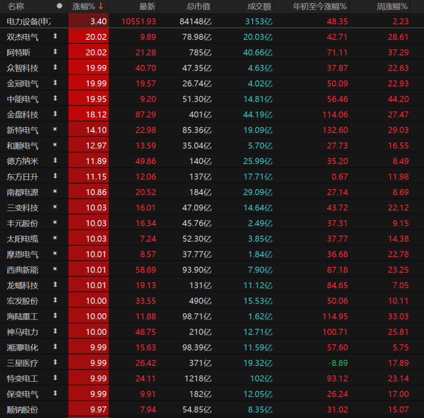 瑞银预测中国将开启十年电力超级周期,直接点燃电力设备板块行情。特高压、虚拟电厂、TOPCon电池等概念大涨,双杰电气、阿特斯等20只个股涨停,金盘科技、东方日升等涨幅超10%。煤炭、环保等板块亦跟涨,市场呈现“高切低”特征。
