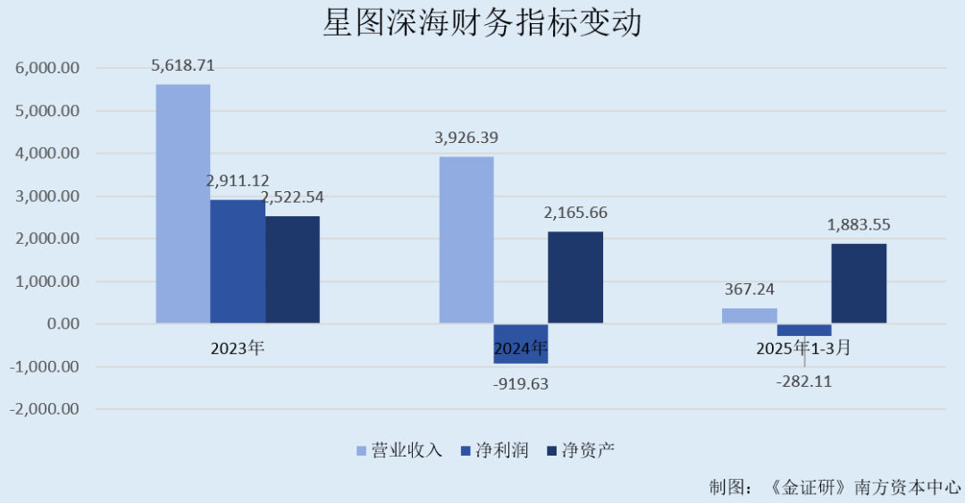 由此可见,2023年,星图深海的营业收入超过五千万元,净利润接近三千万元。然而,2024年,星图深海的营业收入下滑,且净利润为负。而截至2025年一季度,星图深海仍处于亏损状态。