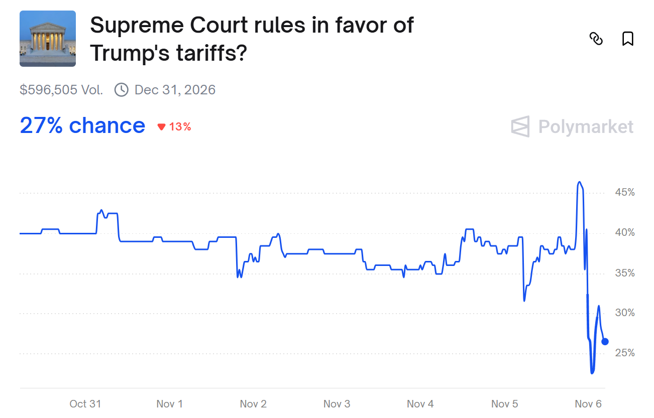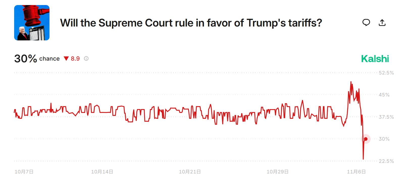 随着最高法院庭审细节的不断披露,预测市场的交易者们大幅降低了法院会支持特朗普关税的概率。在Polymarket平台上,认为最高法院会支持特朗普关税的合约概率,从庭审前的40%直线跳水至不到3成,并且在庭审期间一度跌破20%。而在Kalshi平台上,相关合约的概率也快速下跌至30%。