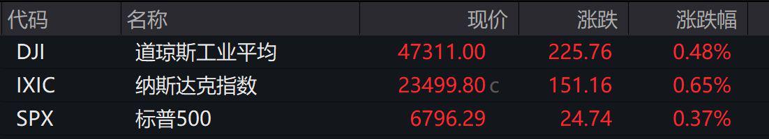 美东时间11月5日16:00(北京时间11月6日5:00),美股三大股指收盘表现强劲。道琼斯工业平均指数收涨225.76点,报47311点,涨幅为0.48%;纳斯达克综合指数收涨151.16点,报23499.8点,涨幅为0.65%;标准普尔500指数收涨24.74点,报6796.29点,涨幅为0.37%。