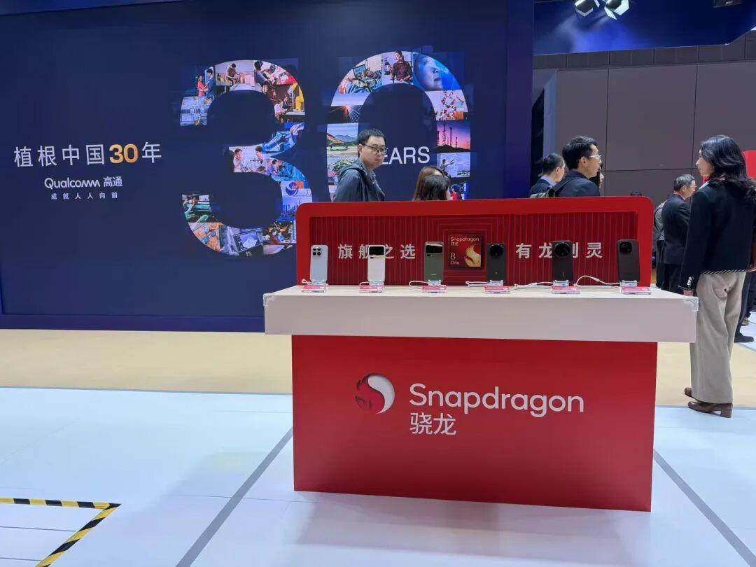 本届进博会的高通展台上,小米、荣耀、红魔、iQOO、一加、realme、努比亚等品牌最新发布的国产旗舰手机齐聚亮相,它们均搭载了高通于今年9月底发布的第五代骁龙8至尊版移动平台。
