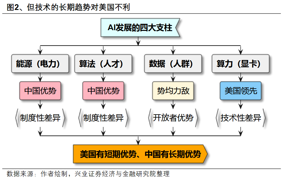 王涵进一步分析指出,中期来看,美股的基本面逻辑(AI霸权)或终将被证伪。在对AI发展至关重要的四个领域(能源、算法/人才、数据、算力)中,美国在能源(电力基础设施)领域处于劣势;算法(人才)上不占优势;在数据领域,“美国优先”动摇了其制度性开放的根基,导致美国的劣势也在扩大;而其仅存的算力(显卡、芯片)优势也并非牢不可破。