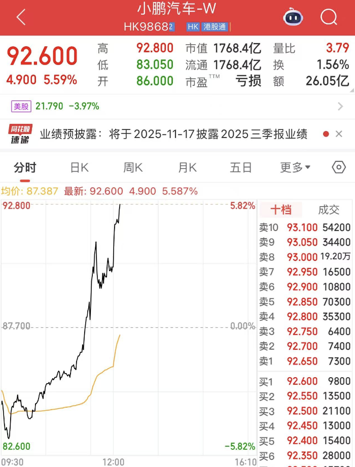 何小鹏的回应视频发布后,效果立竿见影。小鹏汽车(09868.HK)港股直线拉升,从最低82.6港元一路上冲至92.6港元,股价上涨超5%,市值约为1768亿港元。这一涨幅不仅彰显了市场对小鹏科技实力的认可,也反映了投资者对小鹏未来发展的信心。