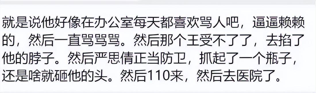 根据网传描述,事件起因于闫思倩在办公室情绪激动、骂骂咧咧,王子建因无法忍受而采取激烈行动,掐住闫思倩的脖子。随后,闫思倩进行正当防卫,使用烟灰缸或瓶子击打王子建头部,导致对方受伤。最终,现场人员报警,受伤者被送往医院接受治疗。