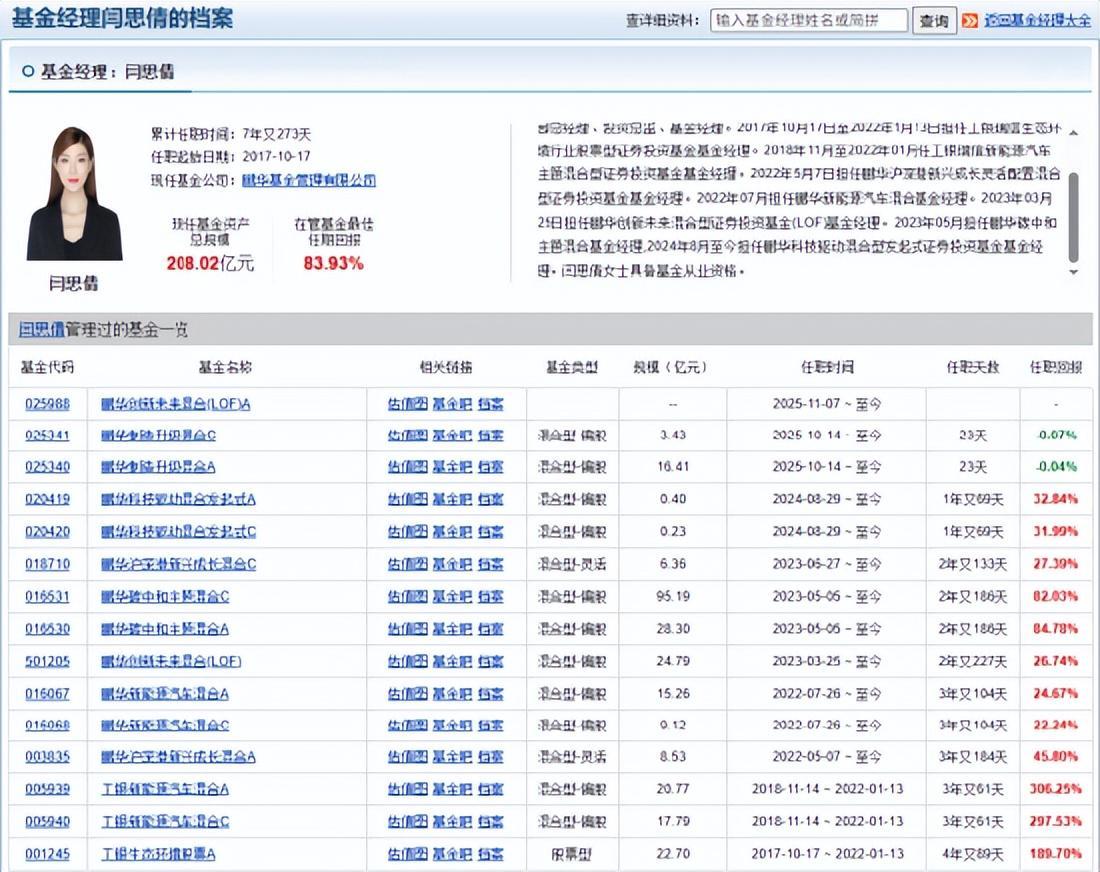 公开资料显示,闫思倩女士为中国国籍,拥有硕士学位,曾任职于华创证券、中银国际证券及工银瑞信基金,担任分析师、业务经理及基金经理等职务。2022年1月,她加盟鹏华基金,现任权益投资三部总经理、投资总监及基金经理。其管理过的基金产品包括工银瑞信生态环境行业股票型证券投资基金、工银瑞信新能源汽车主题混合型证券投资基金等。在鹏华基金期间,她管理了鹏华沪深港新兴成长灵活配置混合型证券投资基金、鹏华新能源汽车混合基金等多只产品,并于2023年3月25日起担任鹏华创新未来混合型证券投资基金(LOF)的基金经理。