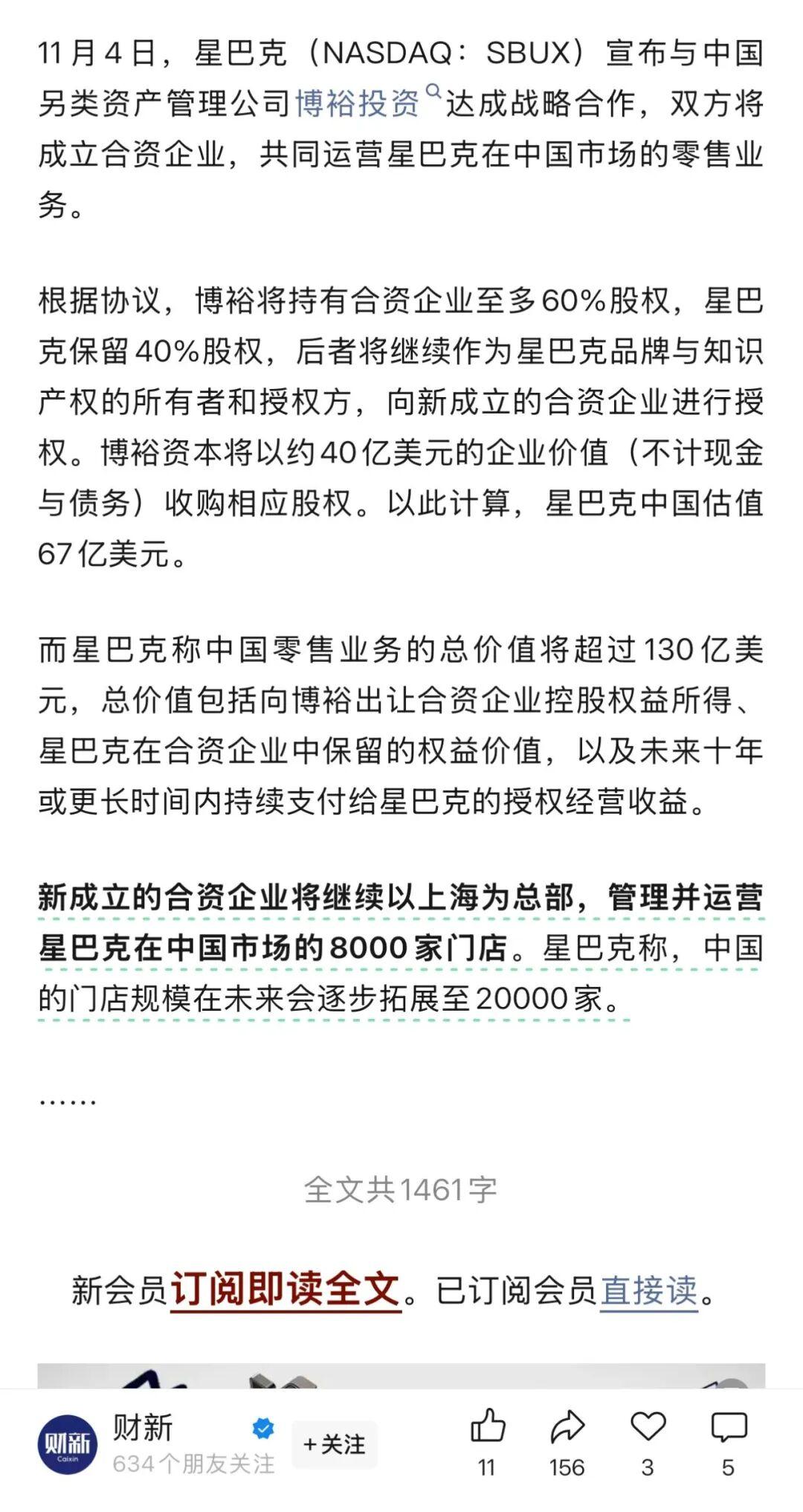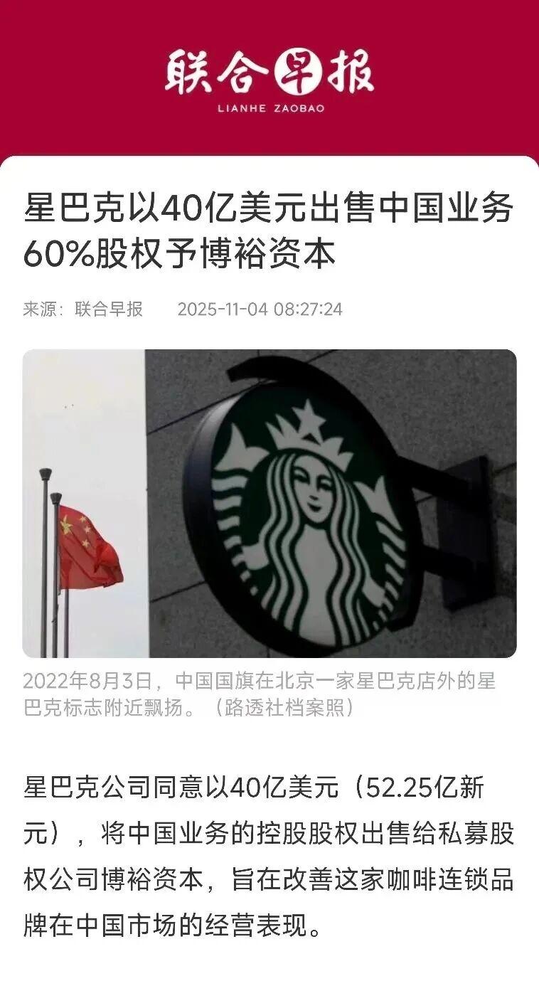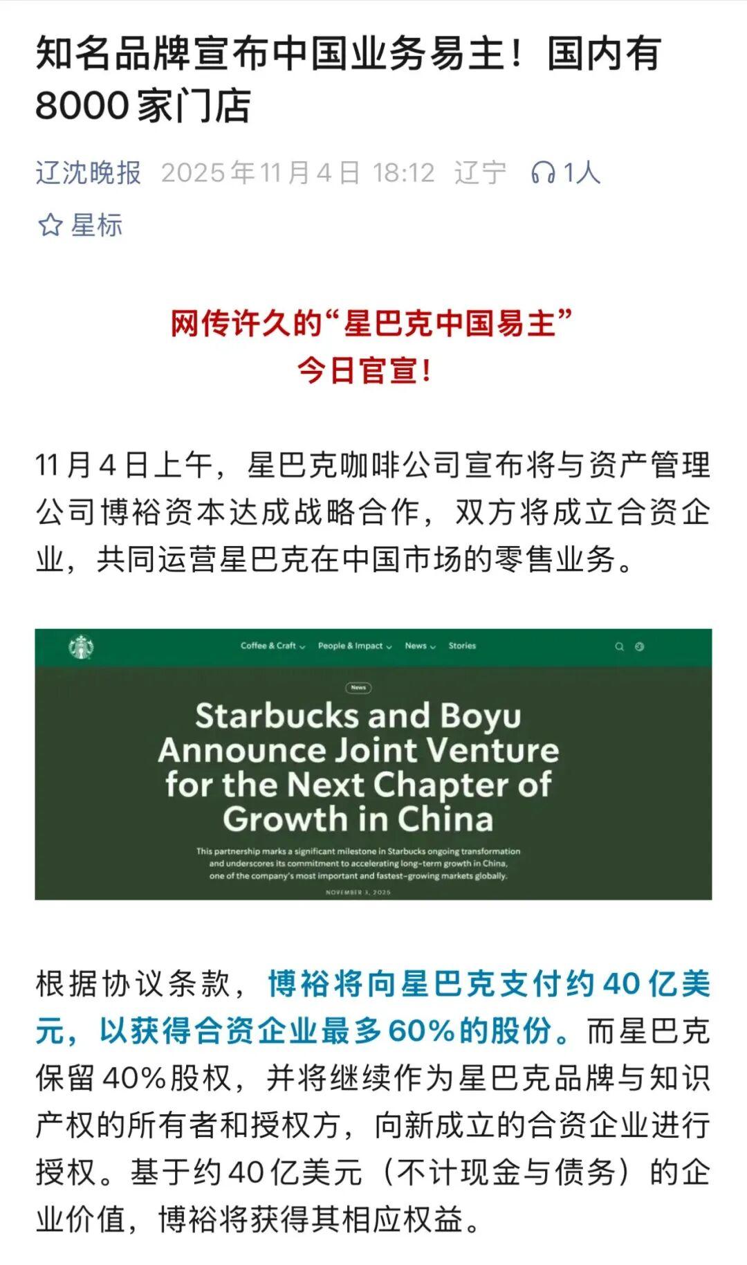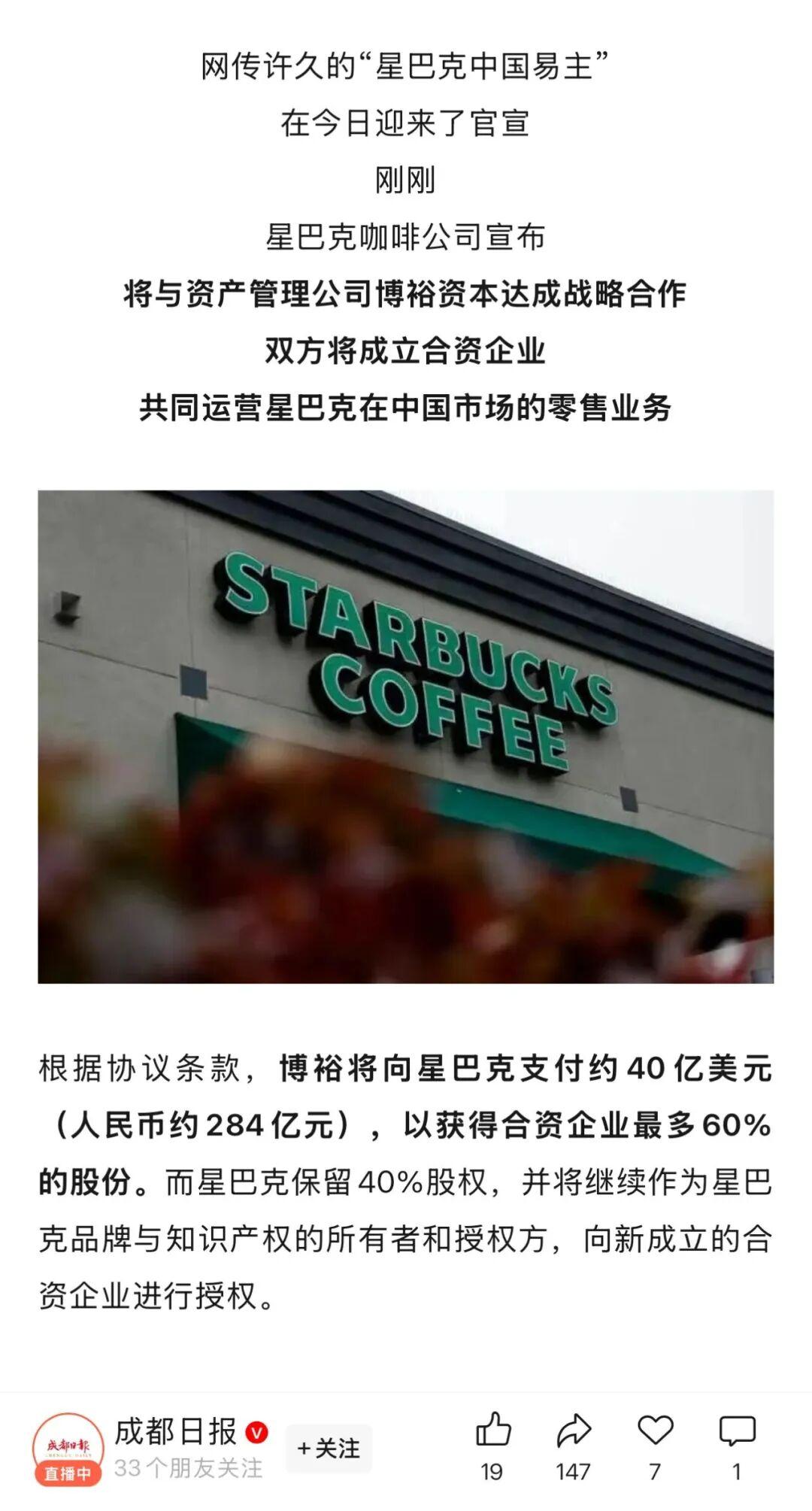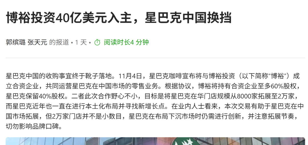 11月4日,星巴克中国正式宣布与博裕资本达成合作,双方将共同成立合资企业以运营中国市场业务。这一消息本应是本周消费资本领域最受瞩目的焦点事件,然而在媒体报道过程中,却出现了一个罕见的“集体乌龙”——多家主流媒体均将星巴克中国的“卖身价”错误报道。