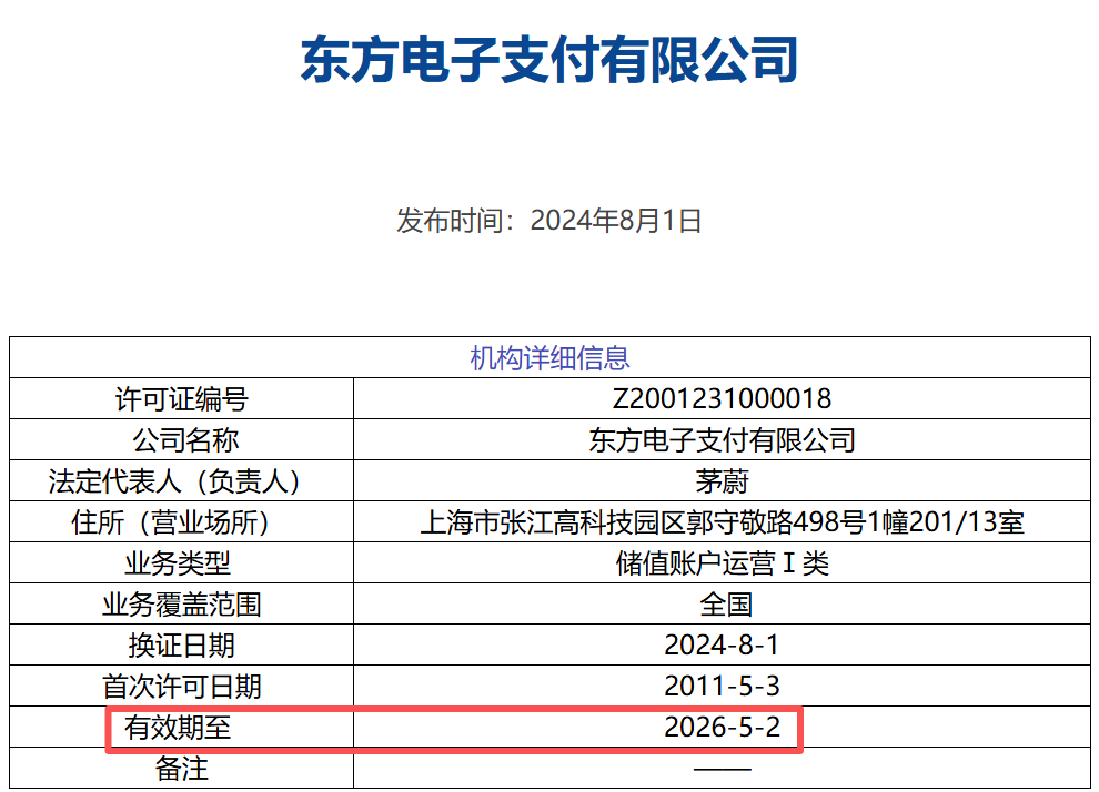 东方支付成立于2008年3月,注册地在上海。公司官网显示,其于2011年5月18日获中国人民银行首批发放的“支付业务许可证”,主要业务包括全国海关税费电子支付业务、自贸区业务,以及跨境人民币、跨境外汇支付业务。据央行官网信息,其许可证有效期至2026年5月2日,业务类型为储值账户运营Ⅰ类。