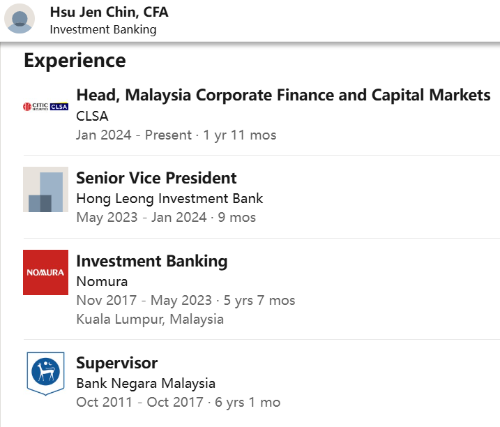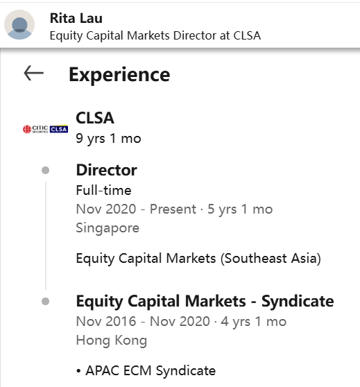 <领英资料显示,Hsu Jen Chin于2024年1月加入中信里昂,此前曾在丰隆投资银行担任要职,其任职时间不足一年即选择离开。Rita Lau则是拥有九年里昂证券工作经历的资深银行家,曾先后任职于汇丰、华泰国际和杰富瑞,长期驻守香港资本市场前沿。